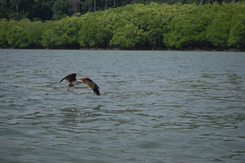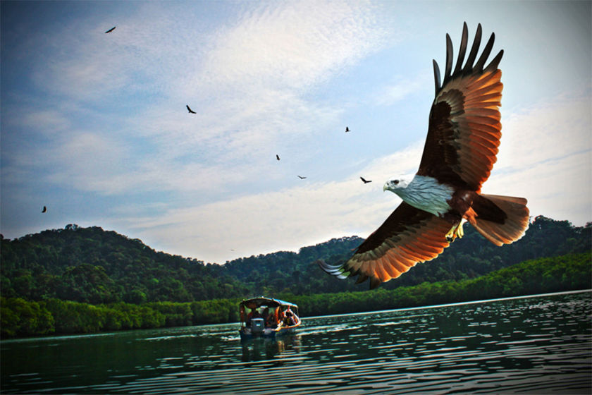 老鹰在兰卡威是当地民众心中膜拜的守护神,船长会将事先准备好的鸡皮抛向空中,瞬间惹得众鹰聚集而来,盘旋掠食再起身直冲天空,野性的英姿庄严而神圣。